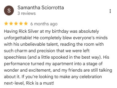 Whether it’s a birthday, anniversary, holiday gathering, or other special occasion, Rick delivers interactive entertainment that feels personal, engaging, and full of surprises.