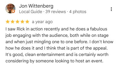 Rick mingles with guests, performing mind-bending feats up close—ideal for cocktail hours and receptions.